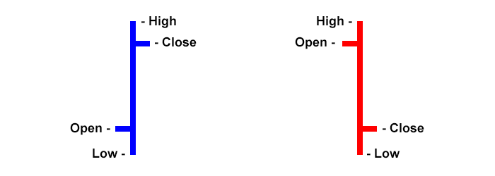 Bar charts step things up a little bit because now you are able to see the opening and closing prices, plus the highs and lows that were made over the duration of the bar. Once again in this next image, we will use the daily frame which means that each bar represents 24 hours of time. These charts are also known as ‘OHLC’ (Open-High-Low-Close) charts.